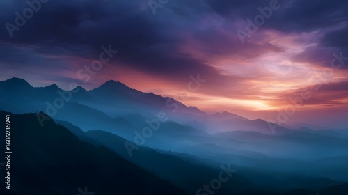 Majestic mountain range illuminated by a vibrant sunrise with layers of mist creating depth and atmospheric haze
