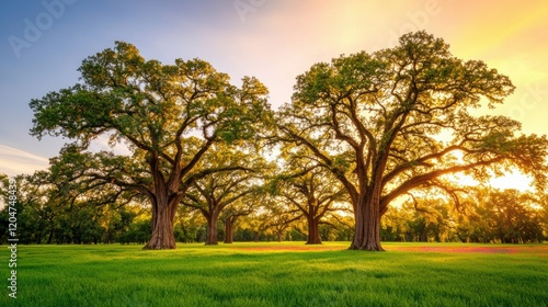 Majestic Oak Trees Under Bright Sunset in Open Green Field