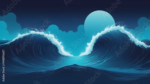 Majestic ocean waves crash under a serene night sky, depicted in a stylized vector illustration. Deep blues and turquoise hues create a tranquil yet powerful mood. Ideal as a background