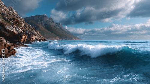 Majestic ocean waves roll and crash against rugged coastal cliffs under a partly cloudy sky. The deep blue sea stretches into the horizon, while the rocky shoreline and towering mountains in the backg