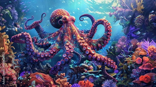 majestic octopus on colorful coral reef incredible underwater wildlife scene digital illustration