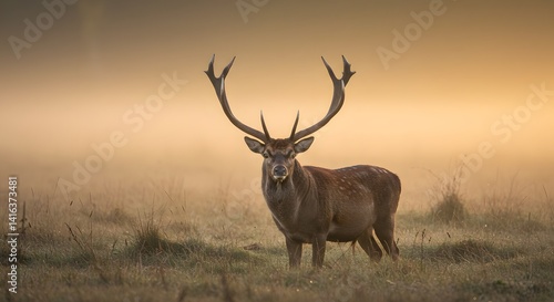 Majestic Red Deer Stag in Misty Sunrise: A Serene Wildlife Scene