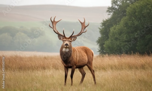 Majestic Red Deer Stag Standing Proudly in a Golden Meadow during Autumn