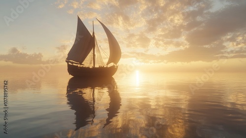 Majestic Sailing Ship Gliding Through Calm Waters Under a Golden Sunrise, Symbolizing Adventure and Tranquility in Nature's Serenity