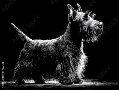 Majestic scottish terrier dog stands proudly displaying its distinctive silhouette against a black background.