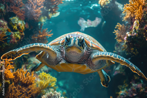 Majestic sea turtle gracefully swimming through crystal blue ocean waters above a vibrant coral reef teeming with life