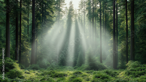 Majestic sequoia trees in foggy landscape with mystical light rays