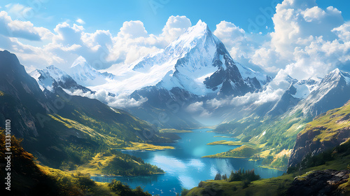 Majestic snow capped mountain peaks rise above lush valleys and shimmering lakes on a clear sunny day in the wilderness of the mountains. Shimmering Caps. Illustration