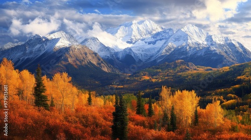 Majestic Snowy Mountain Peak with Autumnal Foliage in the Foreground