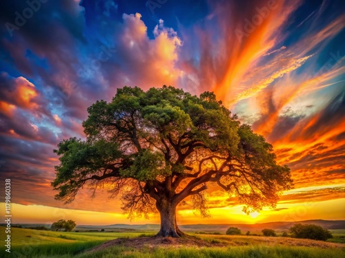 Majestic Spanish Oak Tree at Sunset, Long Exposure Photography