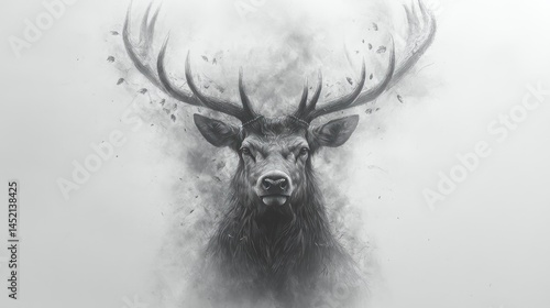 Majestic stag portrait in monochrome, dissolving into smoke and leaves.