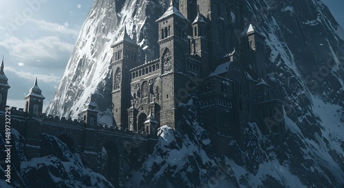 Majestic stone castle amidst snow capped mountains fantasy architecture