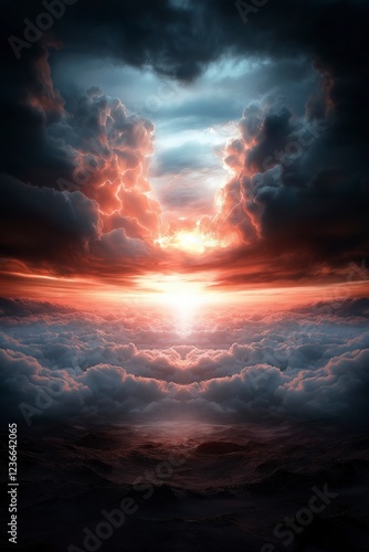 Majestic sunset bathes the clouds in vibrant colors over a serene horizon at twilight. Generative AI