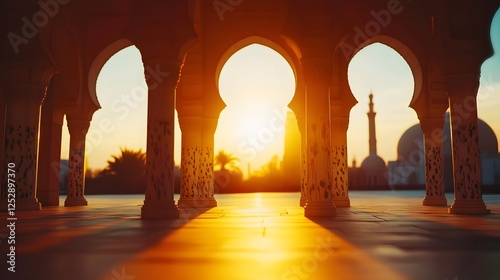 Majestic sunset illuminating architectural arches with palm trees and minarets in the background