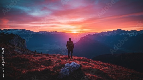 Majestic Sunset Over the Mountains: A Solitary Figure Contemplates the Vastness of Nature