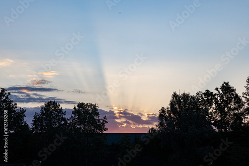Majestic sunset with rays of light breaking through clouds, illuminating silhouettes of trees in a tranquil evening landscape