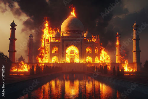 Majestic Taj Mahal engulfed in flames at sunset, reflecting in water, dramatic sky backdrop