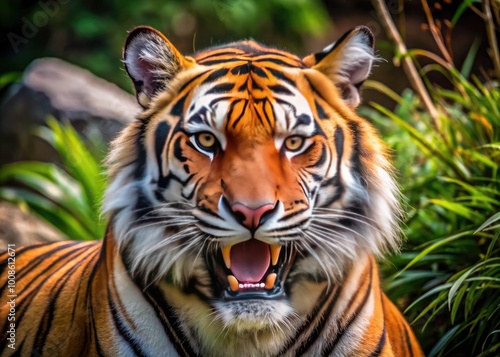 Majestic Tiger in Mid-Bite, Showcasing Powerful Teeth and Striking Stripes in Natural Habitat