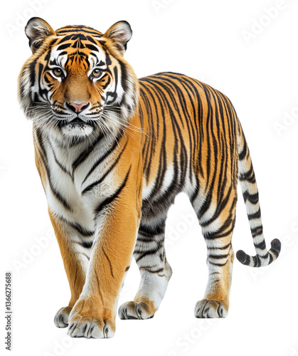 Majestic Tiger Standing with Striking Stripes on White Background, Isolated on Transparent Background