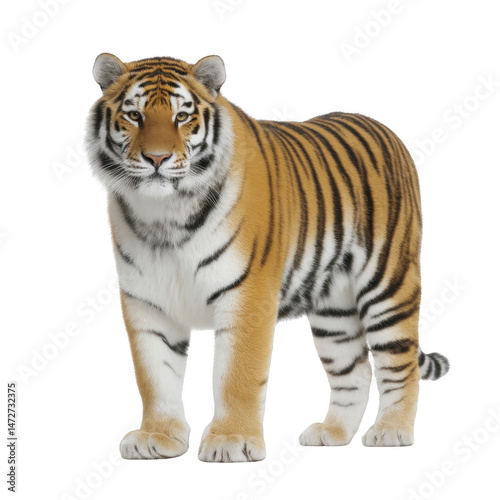 Majestic tiger stands confidently, showcasing its striking orange and black striped fur. tiger powerful build and intense gaze convey strength and grace, embodying essence of wild