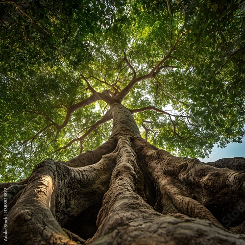 Majestic tree canopy, roots sprawling, sunlight filtering through leaves