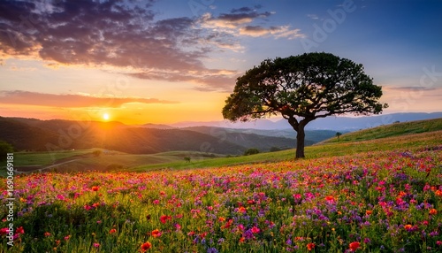 majestic tree stands in vibrant landscape surrounded by colorful flowers and rolling hills sunset casts warm glow creating magical atmosphere filled with tranquility and beauty