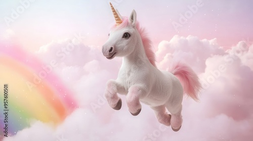 Majestic Unicorn Leaping Over Rainbow in High-Definition 8K Resolution with Sparkling Hooves and Vibrant Fantasy Clouds, Generative Ai