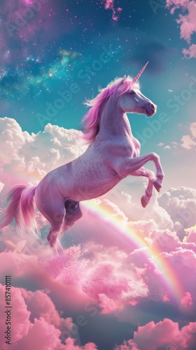 Majestic unicorn rearing in pastel sky with rainbow, fantasy dreamland concept