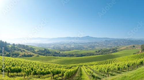Majestic Vineyards: Scenic Beauty of Sunlit Vineyards with Distant Mountain View
