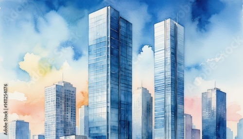 Majestic Watercolor Skyscrapers Towe Over a Vibrant Cityscape with Blue Sky and Partly Cloudy Conditions in Stunning Artistic Detail