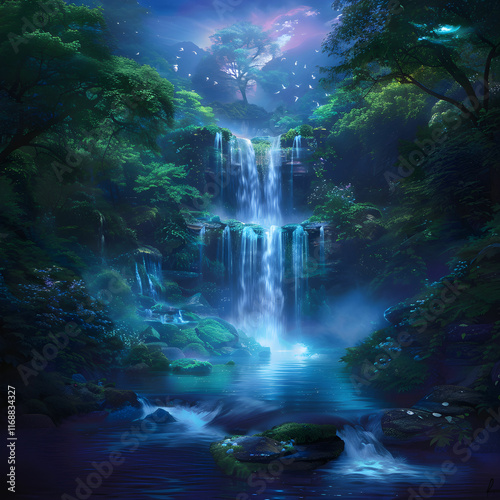 Majestic Waterfall Cascading Through Lush Green Forest Surrounded by Sparkling Mist and Colorful Flora