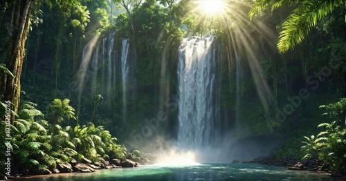Majestic waterfall in a lush tropical forest, sun rays breaking through the trees