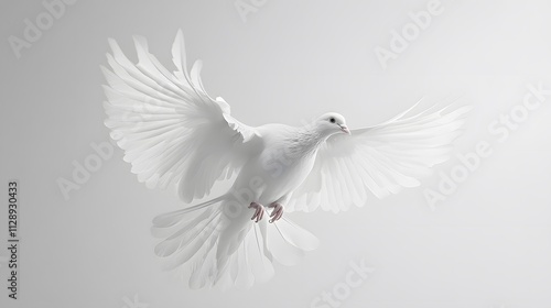 Majestic white dove captured mid-flight displays spread wings and pure feathers in graceful pose, symbolizing peace and freedom against pristine studio background.