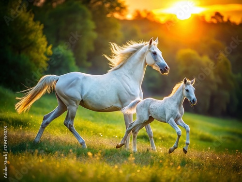 Majestic White Horse and Foal Trotting in Low Light Meadow