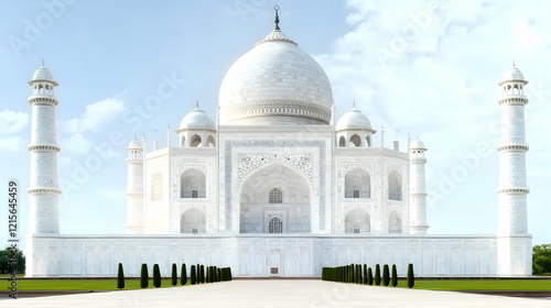 Majestic white marble mausoleum, symmetrical design, green lawn, clear sky.