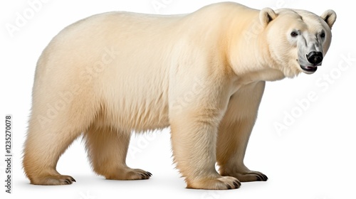 Majestic white polar bear stands out against a pure white background, showcasing its fluffy fur and powerful presence.