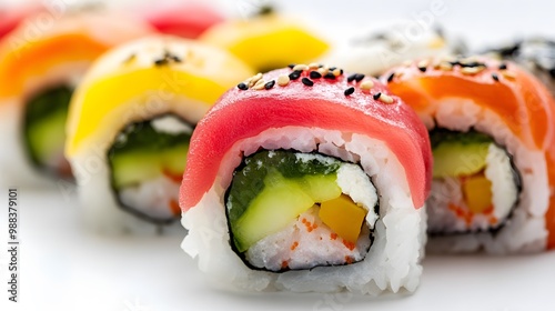Maki rolls with colorful fillings of fish and vegetables, styled artistically on a white surface