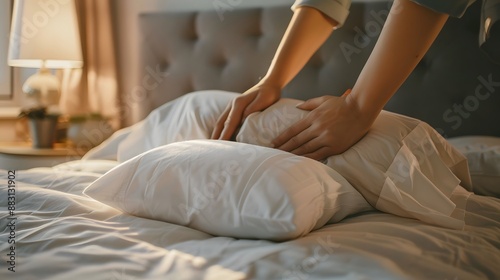 Making a Bed: Hands tucking in sheets and arranging pillows, with a neatly made bed in a cozy bedroom.
