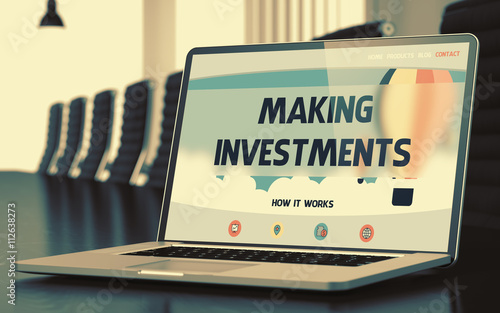 Making Investments on Landing Page of Mobile Computer Display in Modern Meeting Room Closeup View. Toned Image. Blurred Background. 3D Illustration.
