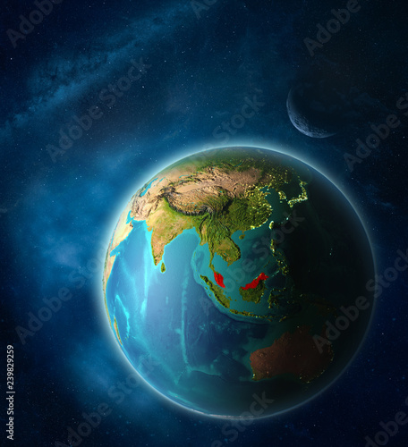 Malaysia from space on planet Earth in space with Moon and Milky Way. Extremely fine detail of planet surface.