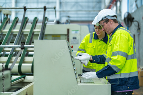Male and female engineers in neat work clothes prepare and control the production system of large modern machines in a factory producing industrial technology products.