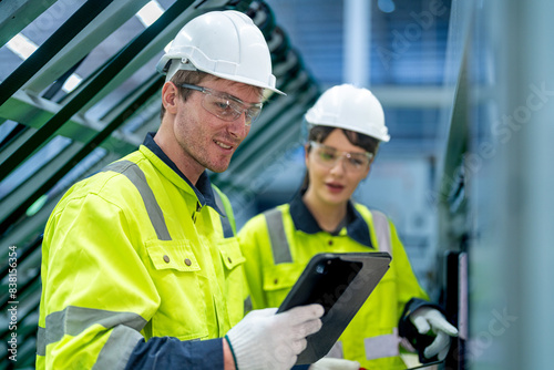 Male and female engineers in neat work clothes prepare and control the production system of large modern machines in a factory producing industrial technology products.