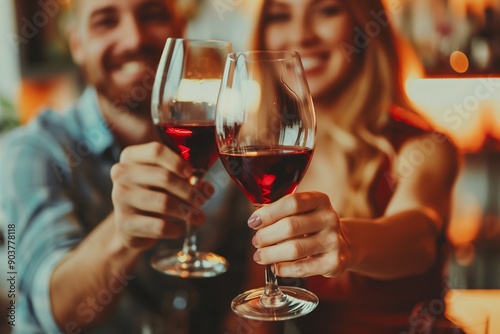 Male and Female in Formal Attire Clinking Glasses of Red Wine with a Focus on Wine Glasses and a Blurred Background