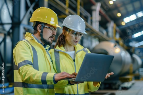 Male and Female Industrial Engineers in Hard Hats Discuss New Project while Using Laptop. They Make Showing Gestures.They Work in a Heavy Industry Manufacturing Factory
