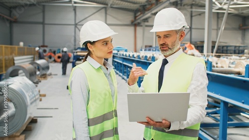 Male and female production engineers having discussion. Two manufactory workers communicating at workshop. Industry workers wearing protective helmets and yellow vests. Metal processing.