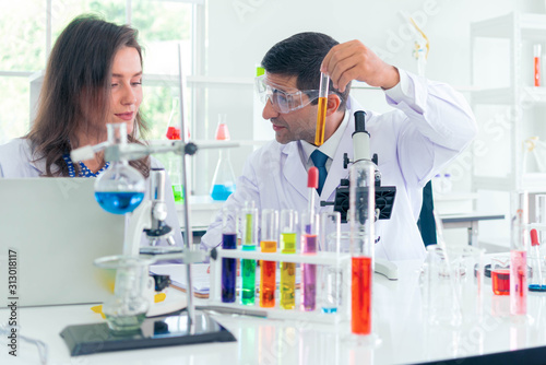 Male and Female scientist with a microscope in front of her reaching out for a test tube with blue solution in laboratory.