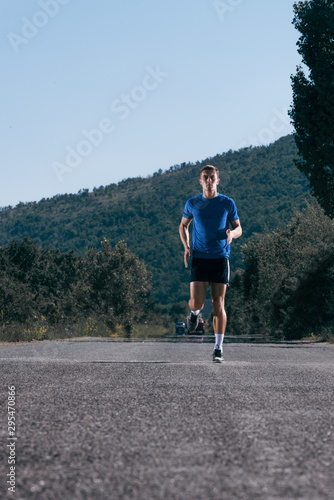 Male athlete running on an empty road in the woods while trying to get to the red finish line.