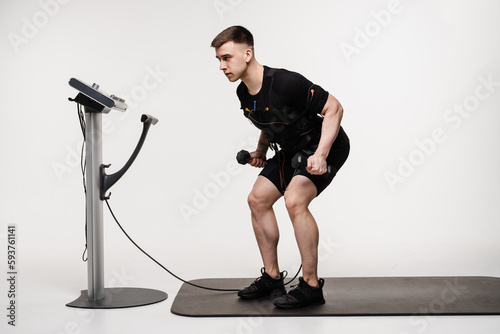 Male athlete with muscular build does workout using EMS suit, which applies electrical impulses to activate muscles. Trainer is doing sport training session using electrical muscle stimulation suit.
