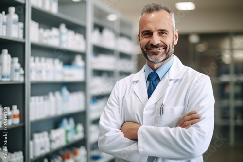 male Caucasian pharmacist stands in medical robe smiling, Portrait of smiling mature male pharmacist standing in pharmacy drugstore,AI generated