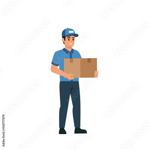 Male courier character standing while carrying a large cardboard box, wearing a blue uniform and cap